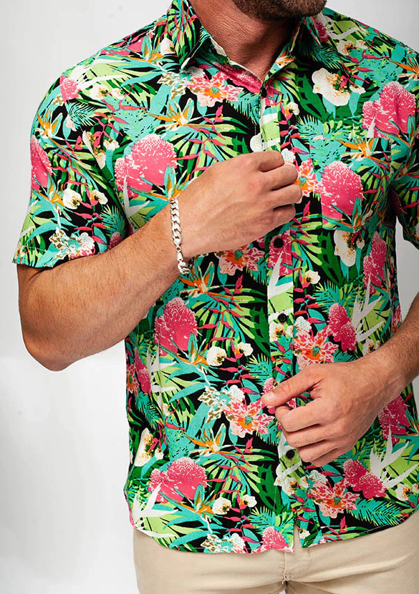 Para um look com camisa florida um pouco mais formal, sugerimos usar uma camiseta branca por baixo, fica estiloso e com um toque moderno.